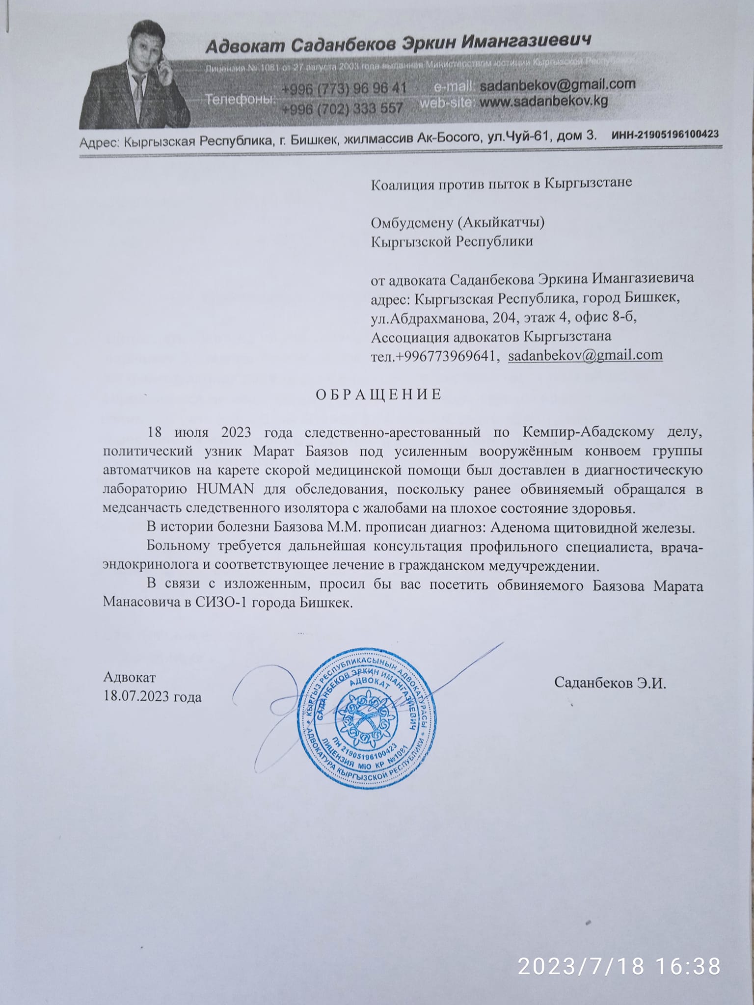 Жактоочу Баязов ооруканада дарыланышы зарыл экенин белгилеп, бул маселе боюнча Кыйноолорго каршы коалиция уюмуна жана Акыйкатчы институтуна кайрылуу жасаганын айтты.